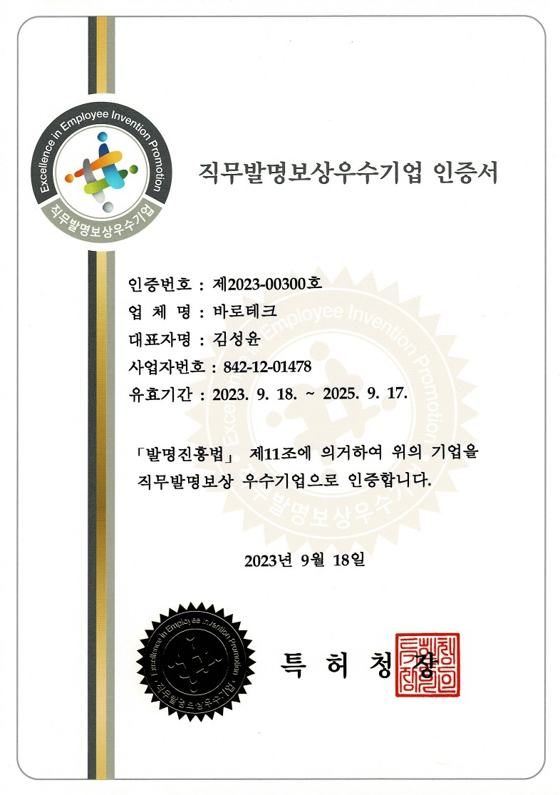 직무발명보상우수기업 인증서 페이지 정보 작성자 관리자 댓글 0건 조회 52회 작성일 24-04-01 13:09 본문 직무발명보상우수기업 인증서 목록 목록 이전글연구개발전담부서 인정서 24.04.01 다음글벤처기업확인서 24.04.01